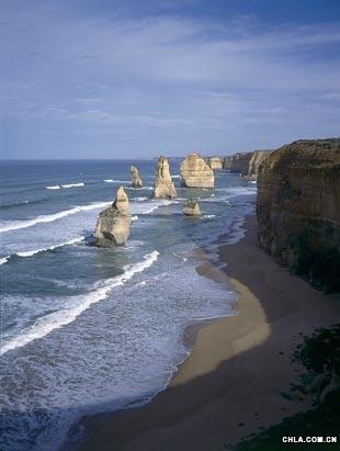 波浪沖擊創(chuàng)造了這些石灰石柱,它們位于澳大利亞維多利亞州的海岸上。最初這些石柱的名字叫母豬和乳豬,后來(lái)為了吸引更多游客,相關(guān)人員給這些天然結(jié)構(gòu)更換了名稱(chēng)。這些石柱底部的風(fēng)蝕速度每年不超過(guò)一英寸。
