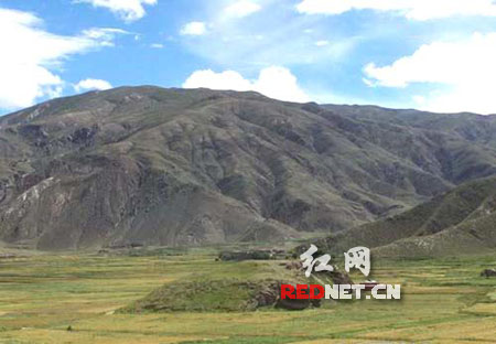 沿著瓊結(jié)縣城往西南方向繼續(xù)前行,遠(yuǎn)遠(yuǎn)望去,只見白云藍(lán)天下,河谷平原上排列著10來座形如土丘樣的山包,與周圍的山丘地形渾然一體,顯得分外壯觀,司機(jī)告訴我,那便是赫赫有名的古藏王墓群。這里風(fēng)光秀麗,南北兩面山脈連綿,中部一塊狹長平地,河流從中穿流而過。田原、山峰、河流、藏胞的房屋和藍(lán)天白云構(gòu)成一幅天然的山水畫,顯然是一處風(fēng)景絕好的風(fēng)水寶地。