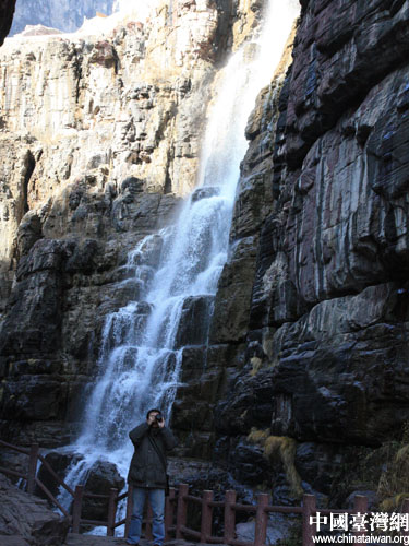 臺媒記者在瀑布旁駐足留影(中國臺灣網 徐維彬 攝)