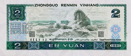 南天一柱位于海南島南部海岸的“天涯海角”風(fēng)景區(qū)里。從這里向南就是茫茫大海,古人認(rèn)為是中國的最南端,于是有“天涯海角”之稱。相傳這里的一塊2米高的巨石曾是支撐天空的柱子的一部分,在共工撞不周山時(shí)碎掉了,清代官員范云梯在巨石上寫下“南天一柱”四個(gè)大字。錢幣上的圖案做了藝術(shù)處理--讓巨石屹立在大浪之中,顯得雄渾壯觀,實(shí)際上這塊石頭的位置是在沙灘上。科學(xué)家說近年氣候變暖海面上升,也許有一天2元人民幣上的圖案會(huì)變成現(xiàn)實(shí)。