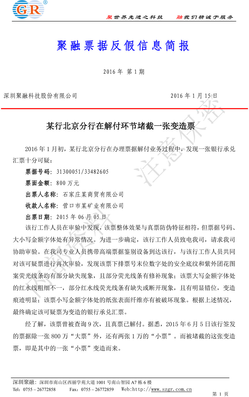 您當前所在位置: 首頁 聚融e訊 案例簡報 反假簡報 某行北京分行在解付環節堵截一張變造票