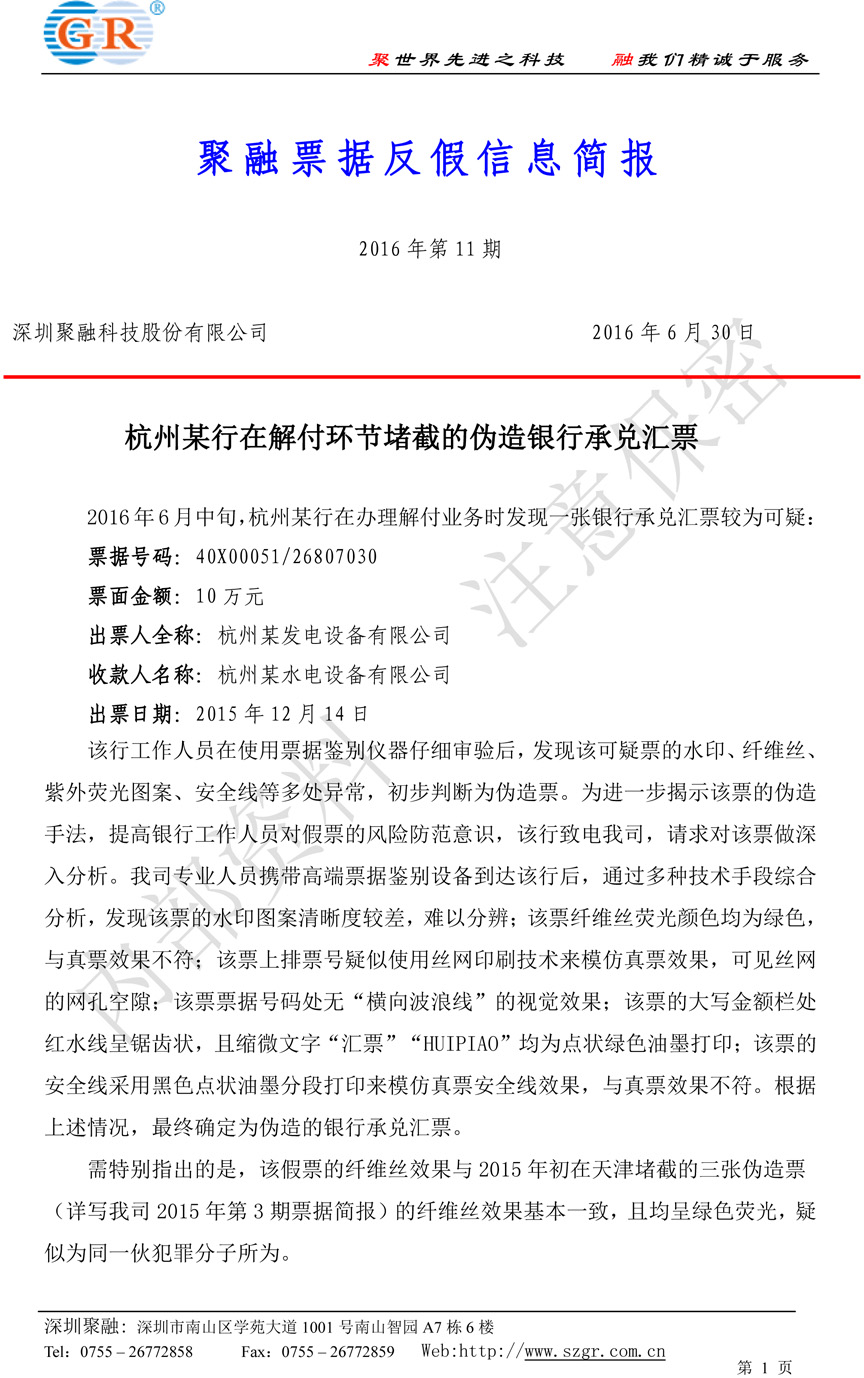 杭州某行在解付環節堵截的偽造銀行承兌匯票