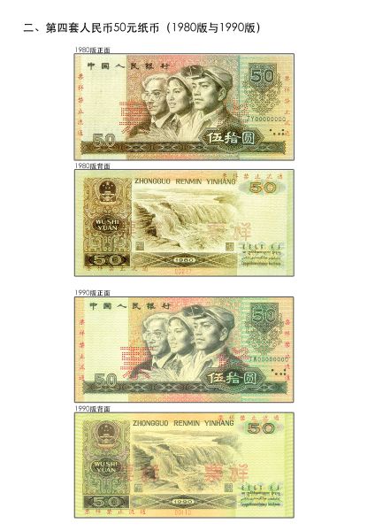 (二)第四套人民幣50元紙幣。其主色調(diào)為黑茶,正面圖案為工人、農(nóng)民、知識(shí)分子頭像,背面圖案為黃河壺口。