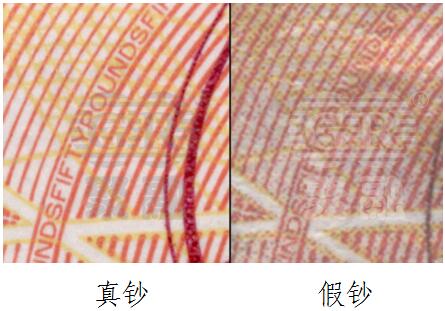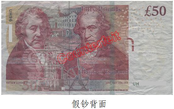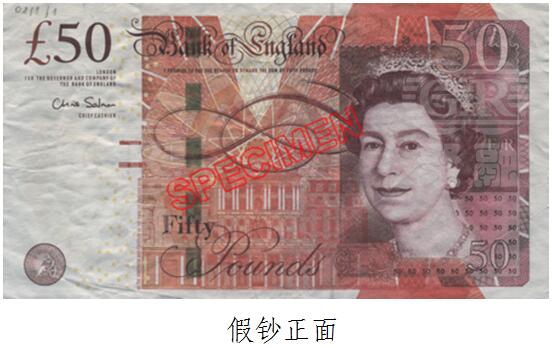近期,市面上堵截一張2010年版50英鎊假鈔,該假鈔的紙張相對真鈔較厚,手感略綿軟。該假鈔對真鈔的水印、安全線、熒光纖維、微縮文字、無色熒光效果等多種防偽特征均有所模仿。