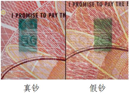 轉(zhuǎn)動觀察,真鈔3D動態(tài)安全線開窗區(qū)域有數(shù)字圖案變換效果,假鈔無此效果。
