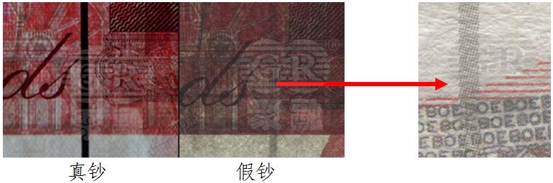 假鈔的微縮文字可以分辨,但微縮文字所在區(qū)域的防復(fù)印底紋有點狀油墨出現(xiàn),與真鈔效果明顯不符。