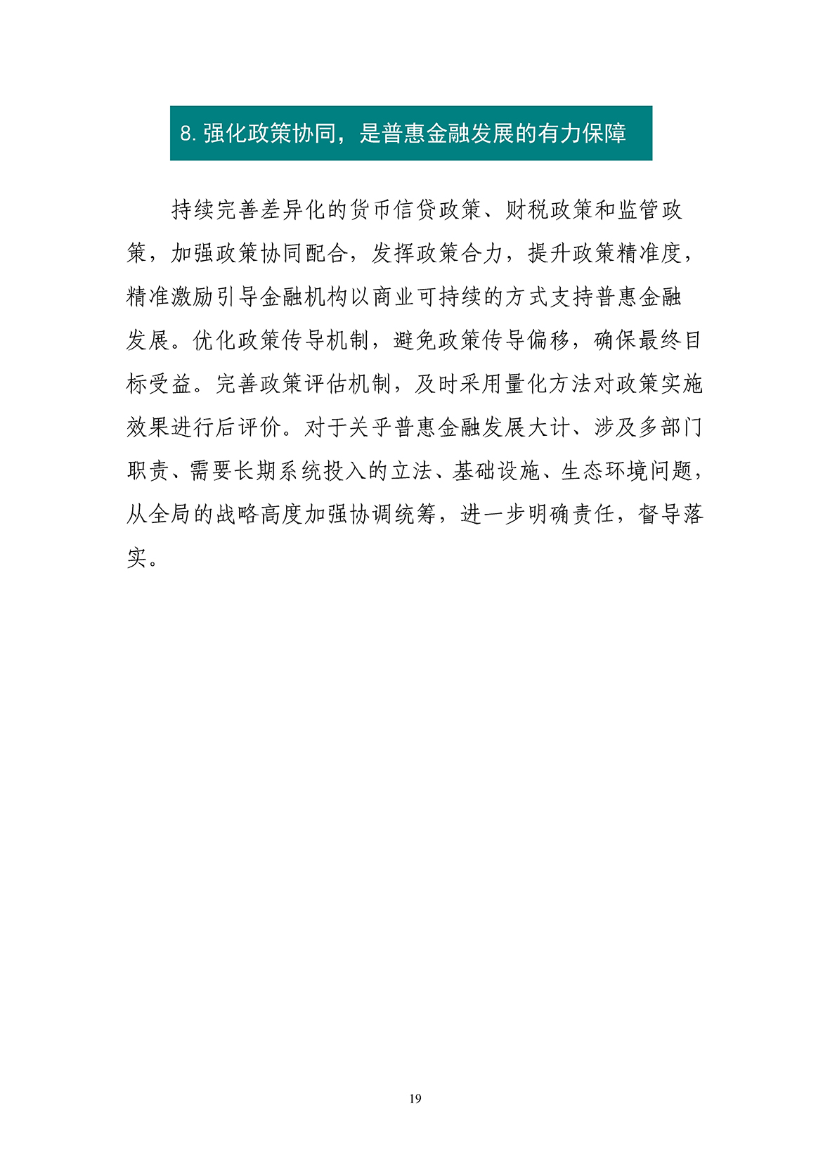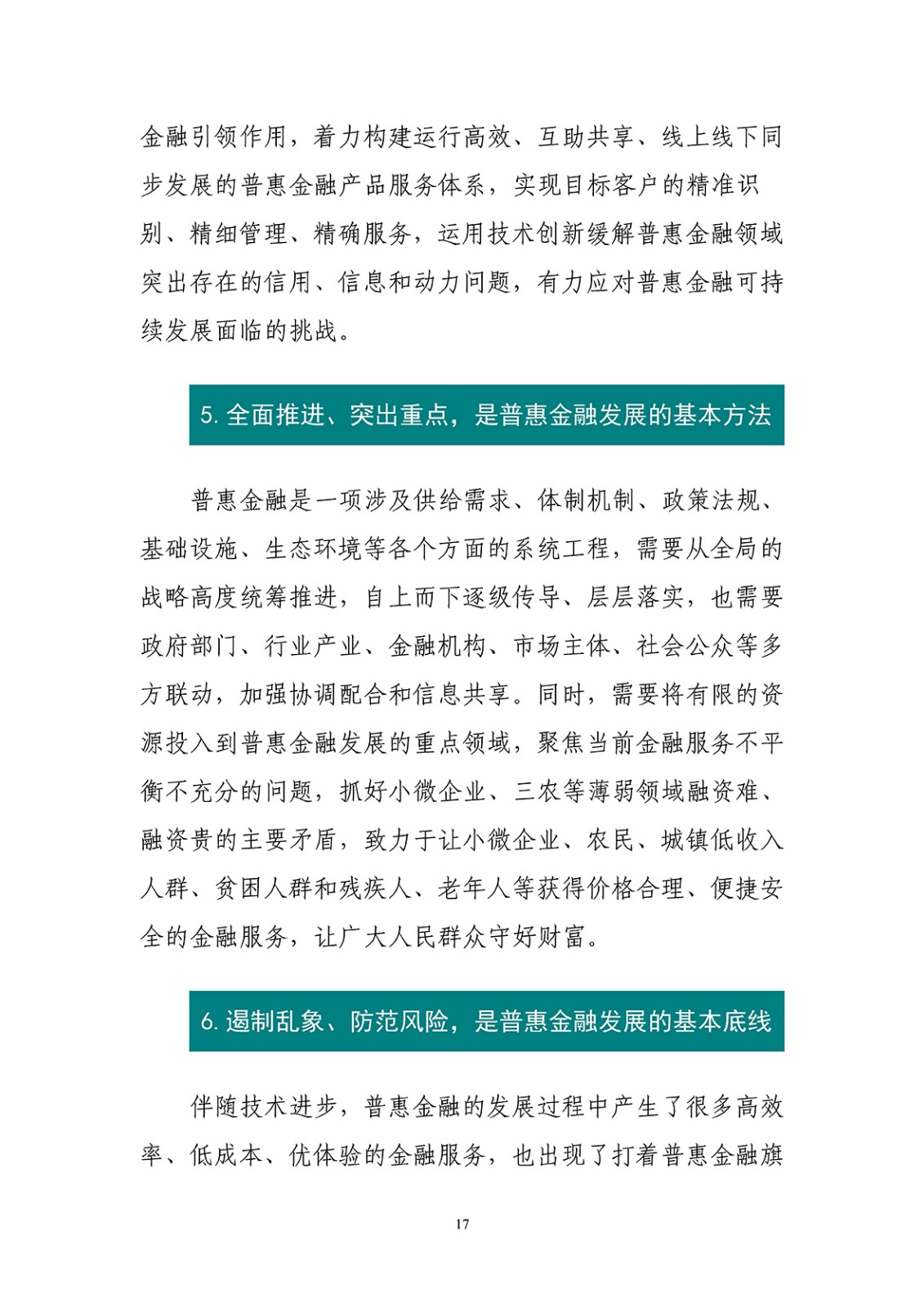 白皮書分析了當前普惠金融發展面臨金融資源配置、金融服務質量、普惠金融的商業可持續、金融基礎設施、金融消費素養等五方面挑戰。應對現存問題與挑戰,要深入貫徹黨的十九大精神,立足新時代發展普惠金融的新要求,突出抓好普惠金融供給體系、產品服務體系、政策環境支撐體系、風險防范和監管體系、消費者教育保護體系等五大體系建設,不斷拓展普惠金融服務的廣度與深度,統籌實現“普”和“惠”的雙重目標。