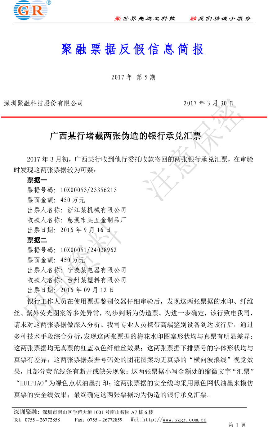 您當前所在位置: 首頁 聚融e訊 案例簡報 反假簡報 廣西某行堵截兩張偽造的銀行承兌匯票