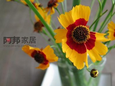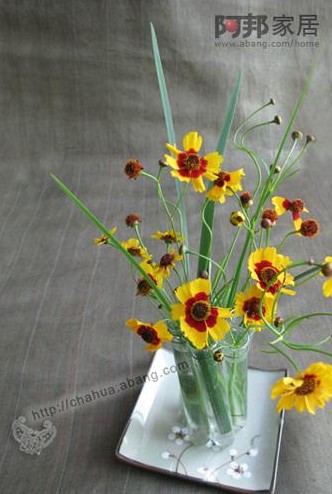 因為想表現(xiàn)秋天的感覺,所以選了這金黃的小菊來插。一枝枝地插在試管里像跳動的音符,渲染著快樂的氣氛。綠色的碟在這里也恰到好處。試想如果是黃色的?花就跳不出來了。如果是藍(lán)色的就不是秋天的感覺了……